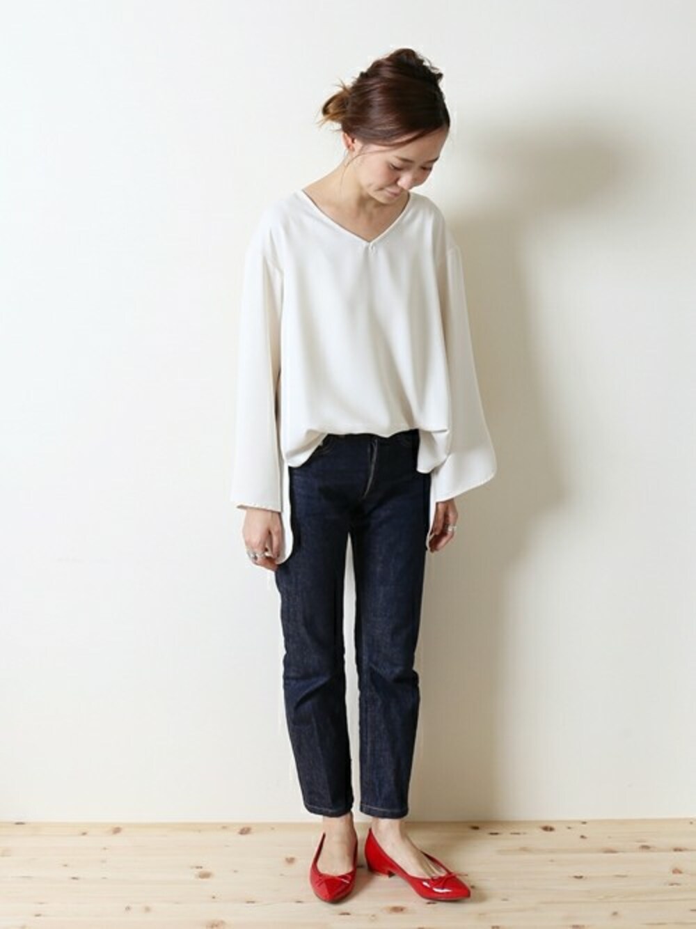 つやつやのレッドが可愛いバレエシューズは春の新作です! シンプルなデニムコーデに合わせて、足元を主役にスタイリング。