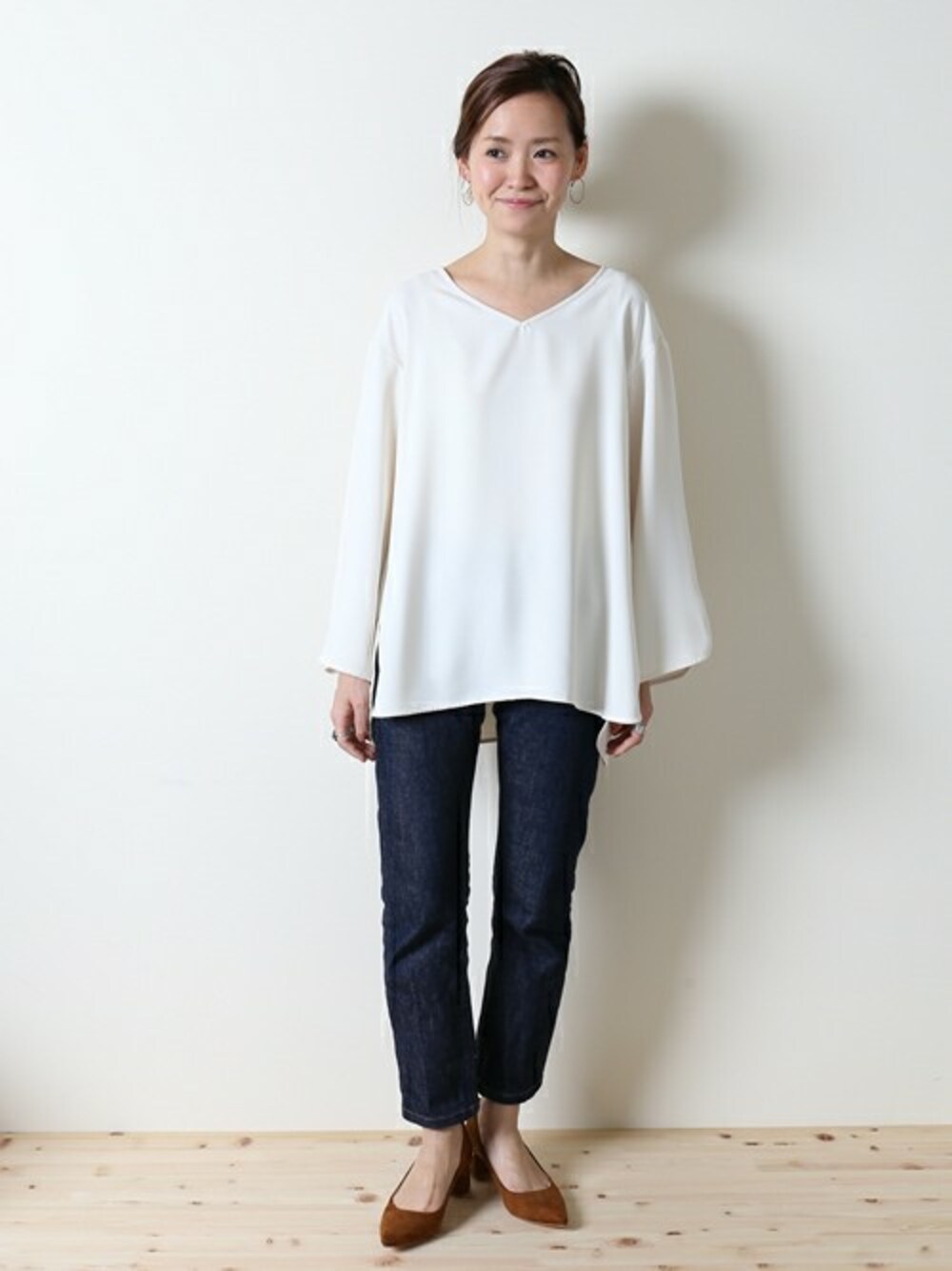今すぐスタイリングに取り入れやすい、上品なキャメルカラーのパンプスがおすすめ! シンプルながら、かかとのスタッズでモードな雰囲気を効かせます。