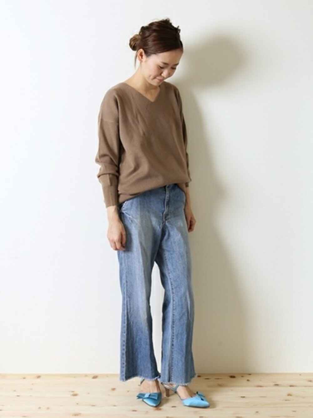 パッと目を引くライトブルーが春の匂いを感じさせます。 甘めのリボンもデニムに合わせればさりげない雰囲気。
