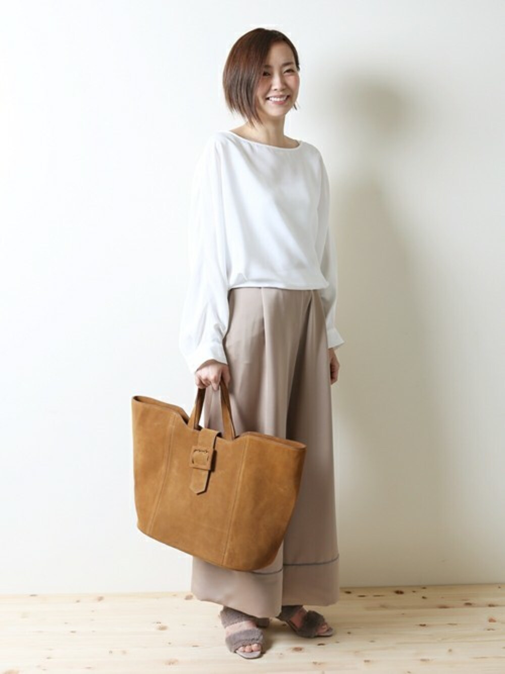 グレーやベージュのカラーで春らしい、ライトトーンのコーディネート。 サンダルのファーやBAGのスエード等、素材感でアクセントをプラス。