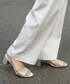 合わせを選ばないシルバーカラーのサンダルを、ホワイトのパンツで爽やかに。 ちらりとのぞくチャンキーヒールが旬の足元です。