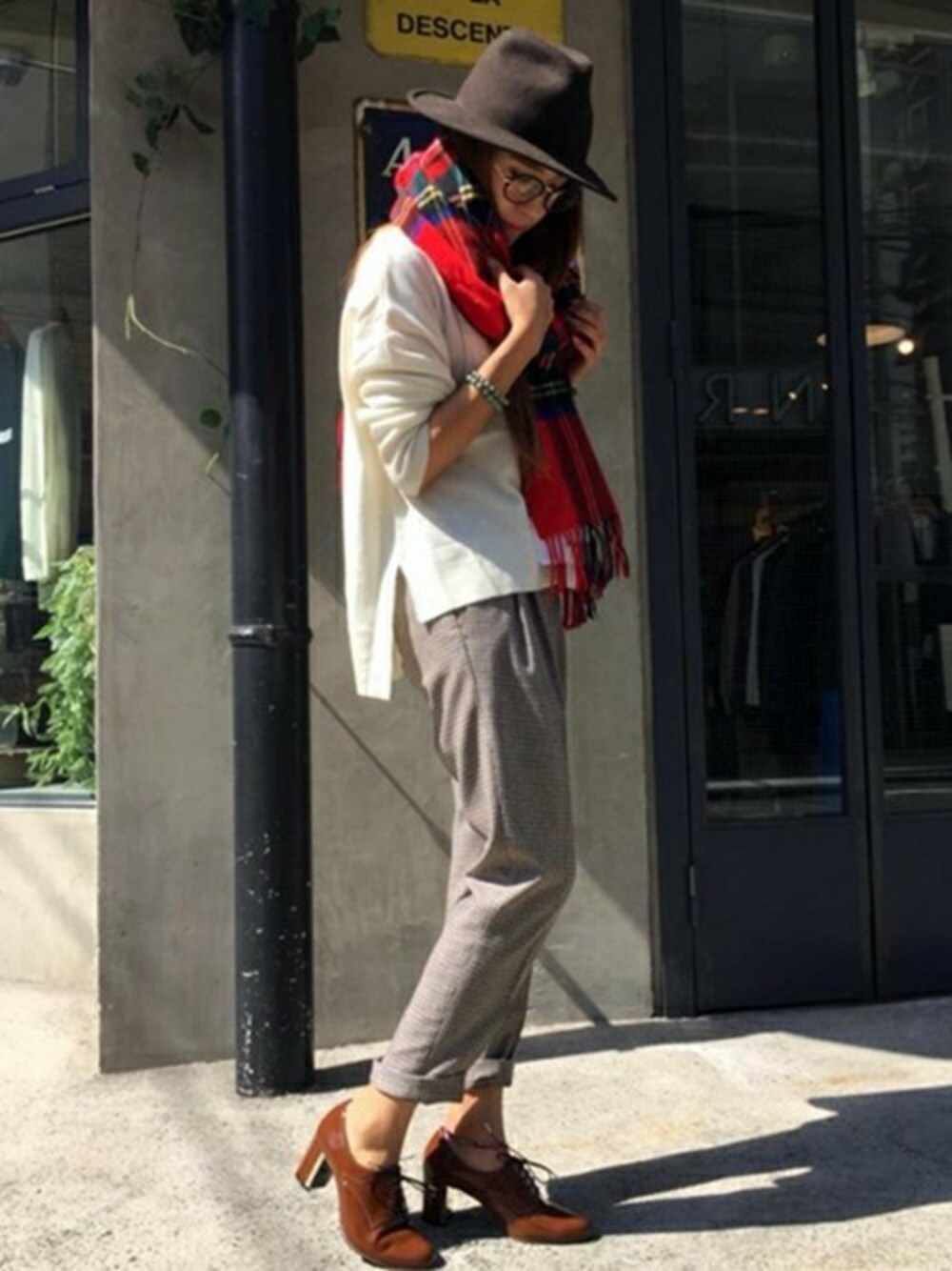パンツとのバランス感がGOOD 差し色に赤のチエックストールで季節感がぐっとUPします♪
