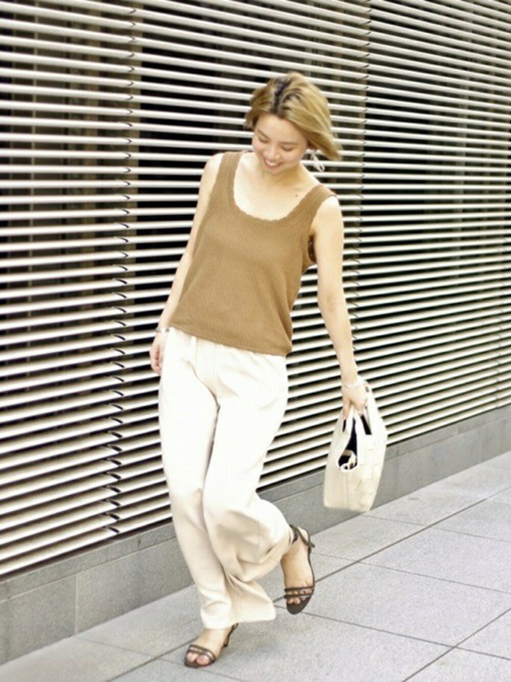 足元にカーキのサンダルを持ってくることで、いつものカジュアルスタイルがぐっと今年らしく。