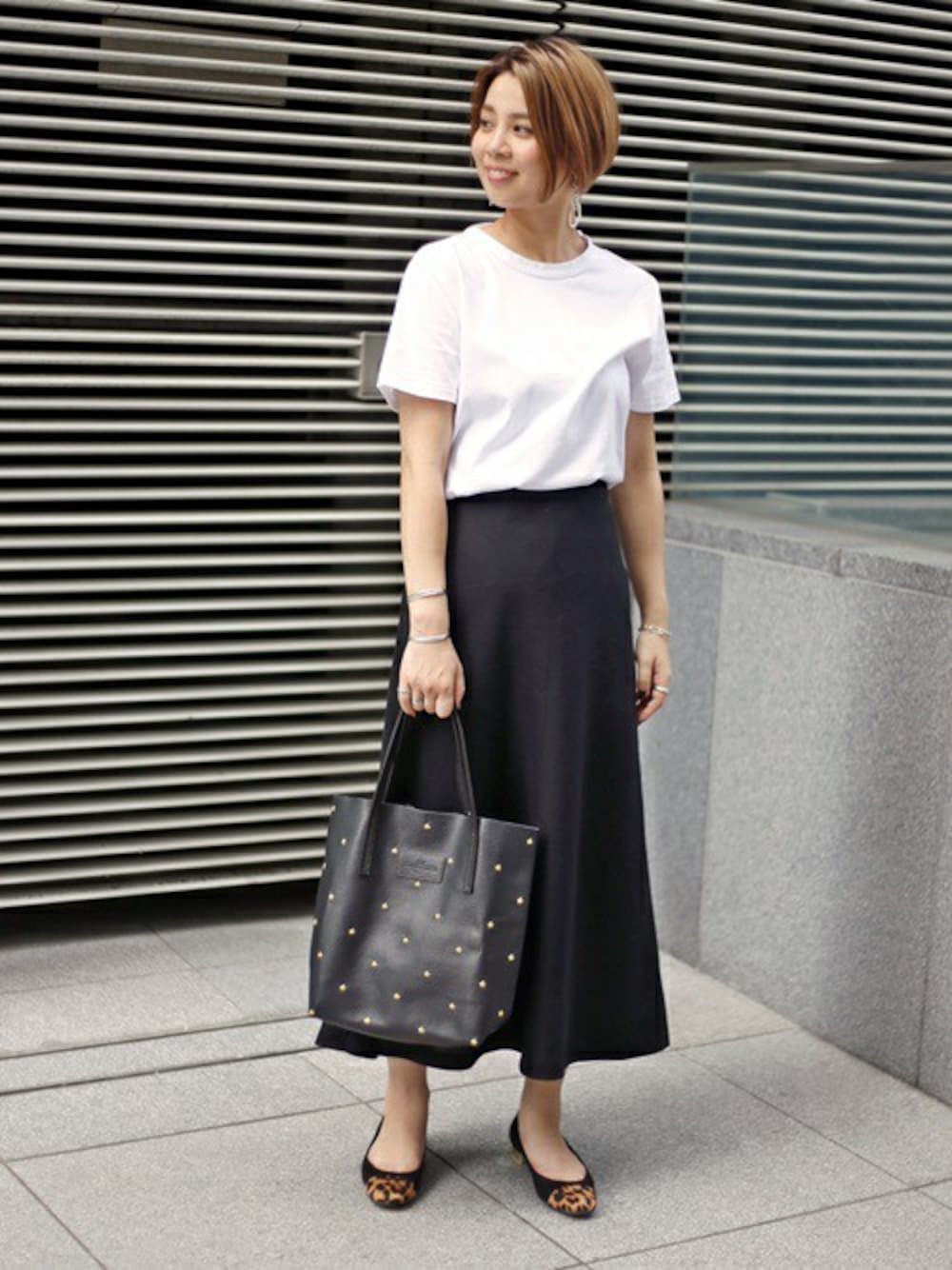 さりげないレオパードが効いているフラットシューズを、シンプルなスタイリングで引き立てます。
