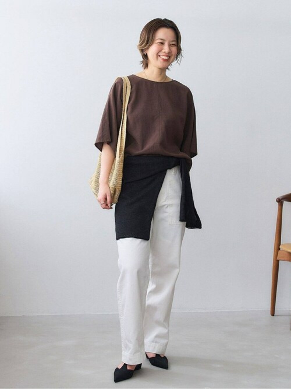 sunaのパンプス「4cmポインテッドTストラップウエッジパンプス」を使ったコーディネート