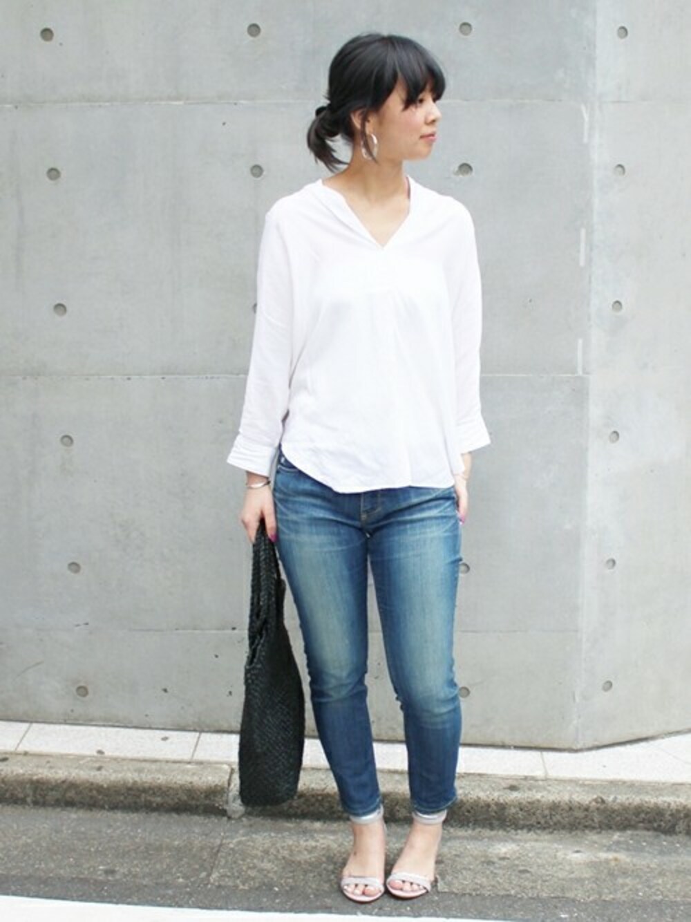 女性らしいヌーディーなデザインのサンダルは、パンツスタイルにシンプルに合わせるのがおすすめ。 ライトグレーの柔らかい色味に、メタリックカラーがさりげなく主張します。