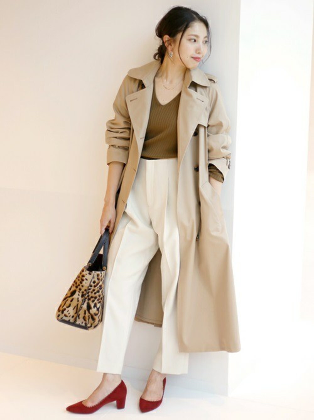 パイピングのデザインが今年らしいパンプスは、甘くならない赤がパンツスタイルにも好相性。