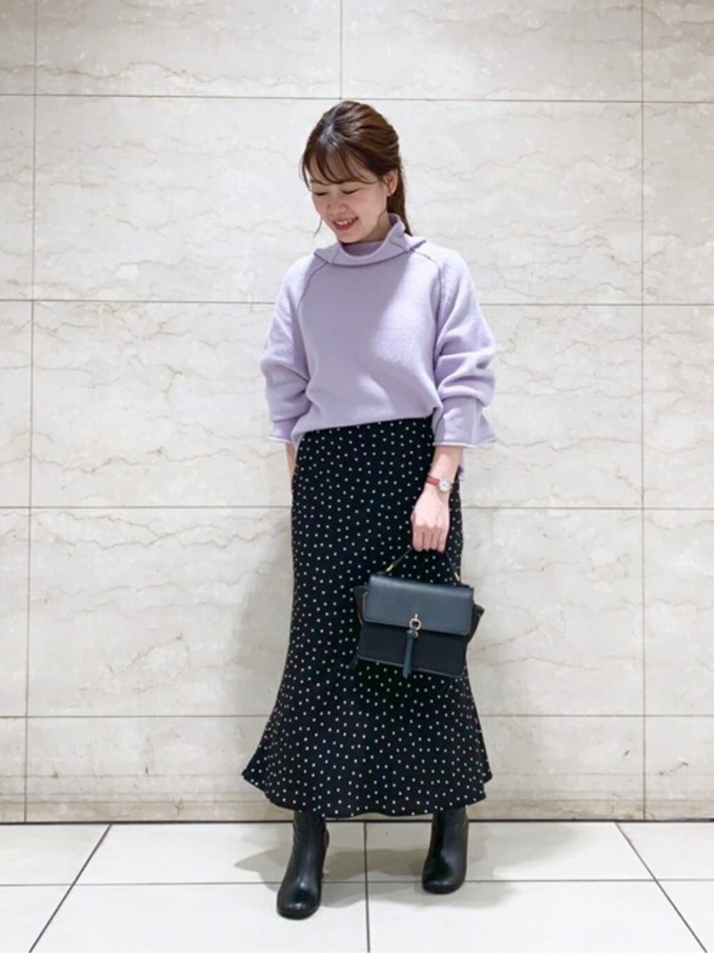 つま先の丸みと、ヒールのデザインが足元に新鮮な印象を与えてくれる一足です◎ ヒールの先端が少し広がっているので、安定感のある履き心地です。 【サイズ感想】 普段サイズ:23.0cm/Mサイズ 着用サイズ:Mサイズ 足幅:広め/外反母趾 筒周り:隙間なくぴったりですが、とても柔らかいレザーなので問題なく履けそうです。 横幅:外反母趾ですが、タイツや靴下で合わせても楽に履けます。 縦幅:指先も程よく余裕があり、窮屈感などは全くありません。 ストッキングなどで前滑りを感じる際は、中敷を敷くと安定感が増すのでおススメです◎ 【バッグ感想】 折りたたみ財布やポーチ、スマホなど日常的に必要な荷物がしっかりと入ります。