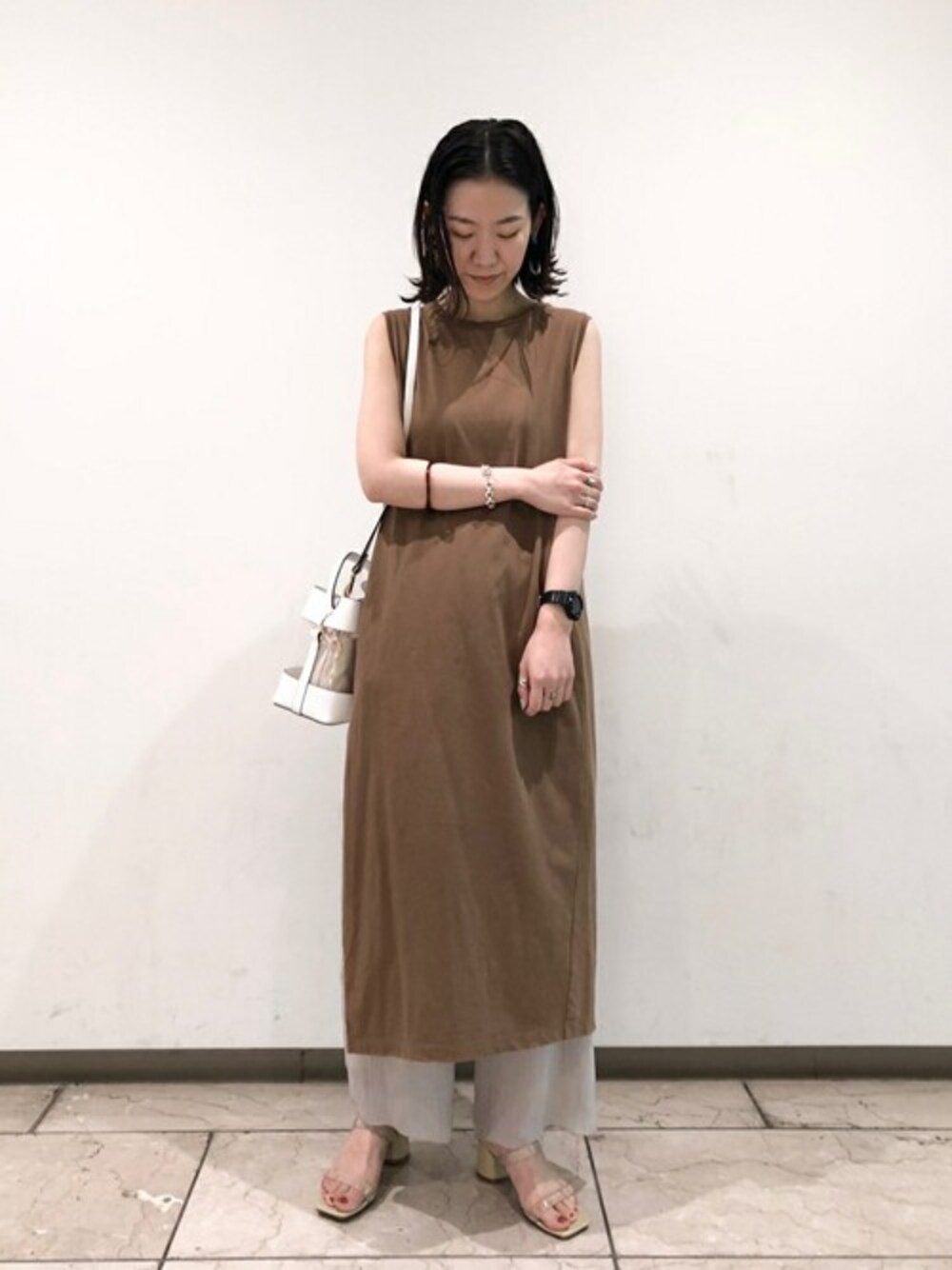 クリア素材が涼しげなサンダル。 5.5cmヒールは安定していて歩きやすく、スタイルアップしてくれます。 【サイズ感想】 普段サイズは24.0cm。足幅広め。 着用サイズM。 Lだと前滑りして少し踵が余ったので、Mサイズにしました。 足幅広めですが、Mサイズでもストラップ窮屈さはなくちょうどよく履けました。