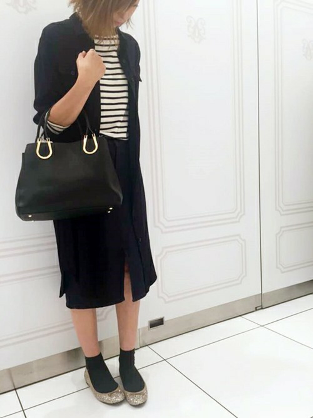 大粒のグリッターがシンプルなモノトーンコーデに映えます。 BAGのパーツとシューズのゴールドをポイントにして、落ちついた秋のスタイルに。