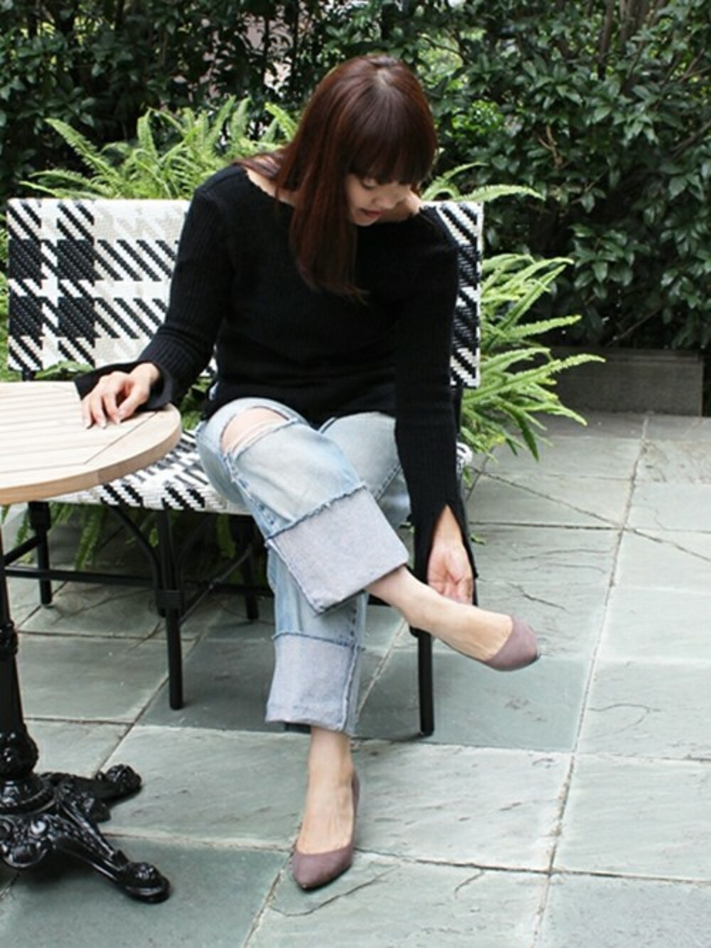 肌馴染みのよいグレーがデニムスタイルを上品な印象にまとめます。 オンオフ活躍する1足ですよ。