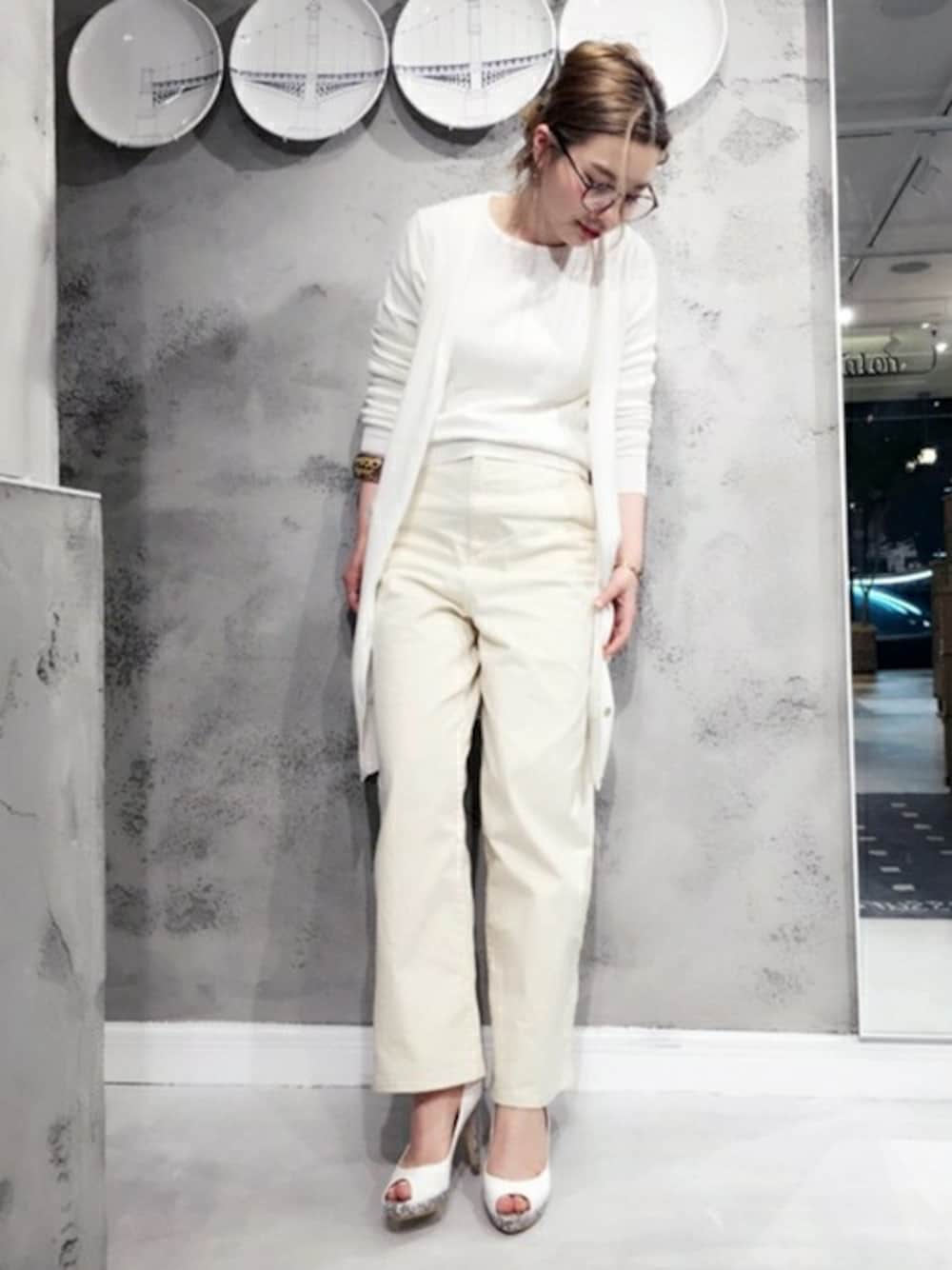 オールホワイトコーデにソールのパイソン柄が辛口アクセント。 高めヒールでパンツスタイルがバランス良く。