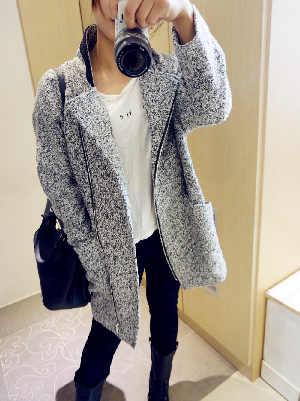 LetoLinのダッフルコート「a052 leto korea 秋冬款部落客款帥氣大翻領配色外套(深灰、淺灰) 現貨中」を使ったコーディネート