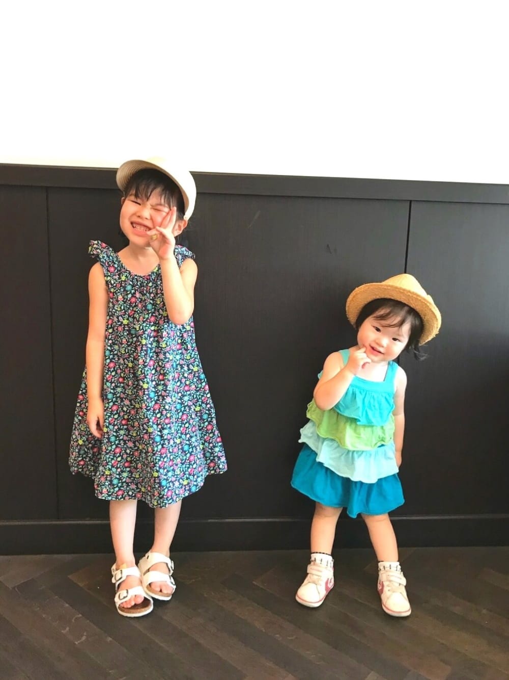暑い中、こども祭りへ🎈 近頃、一人でどこにでも行ってしまう一歳児👧 少し派手めで直ぐ見つけられるように^^; お姉ちゃんの花柄ワンピースは保育園のママ友からのお下がり❁ 肩のフレアや背中のVネックがとても可愛い❤️