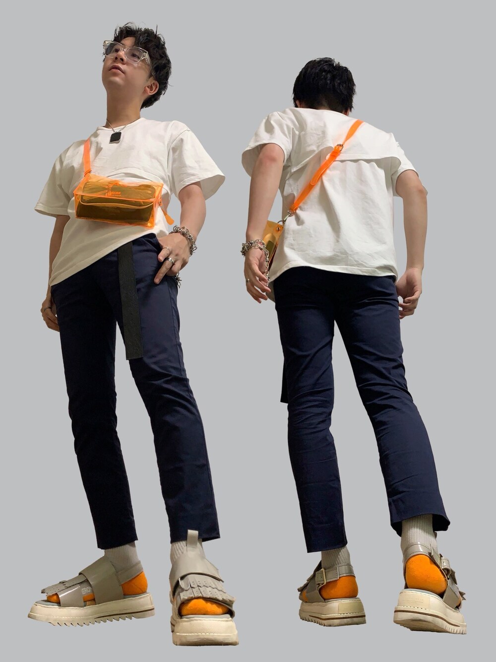 本日はネイビー×オレンジコーデ 最近購入したセパレートレイヤードTEEをシンプルに合わせるべく、ネイビーのパンツを使って小物をオレンジでまとめました PVCバッグに合わせてメガネもクリアフレームで👓 前回フォルダinして下さった izumiさん haruruさん 2gkさん 😈さん ありがとうございます🌟🌟