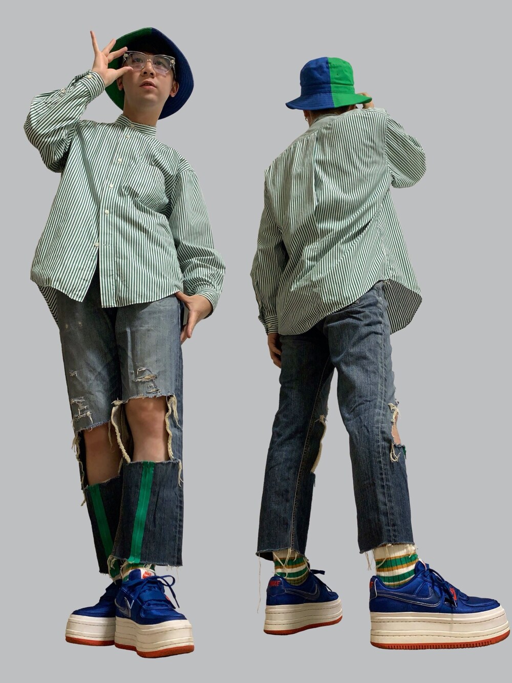 本日はブルー×グリーンのコーデ ポップなカラーリングのアイテムにデニムを入れてカジュアルダウン パンツのダメージは全て自分で入れています🛠