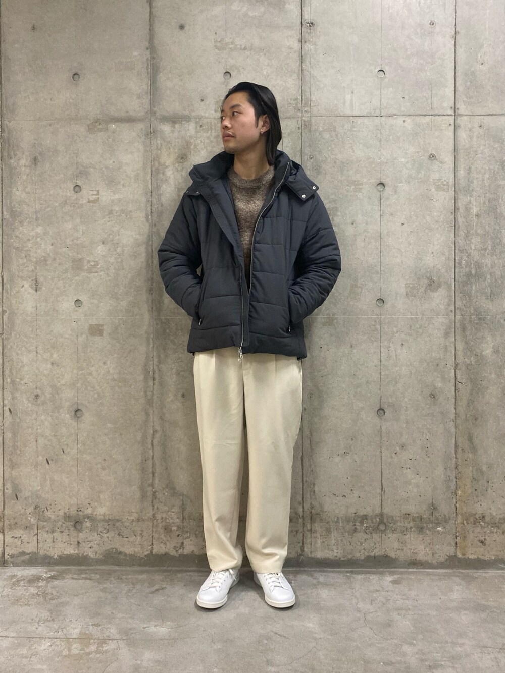 ご覧いただきありがとうございます! マットな生地感で高級感のある見え方の中綿ブルゾン。 ボリューム感もあり、ダウンにも負けない保温力と軽さ◎ 生成色のパンツとホワイトのシューズでクリーンな装いに。 是非ご参考にしてみてください^_^