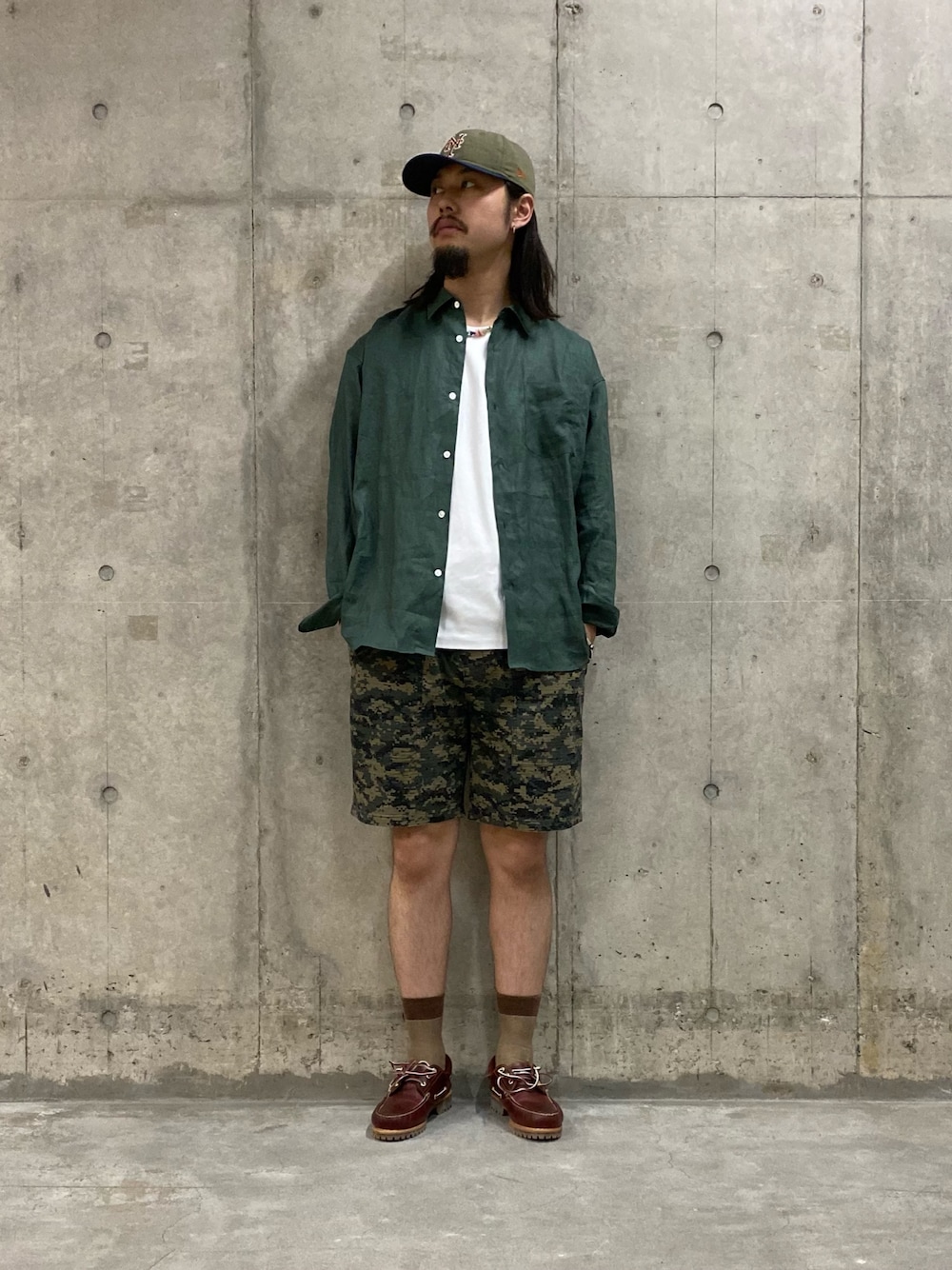 ご覧いただきありがとうございます! 夏を代表する快適アイテムでコーディネート! 「リネンオーバーシャツ」は繊維質な見え方と清涼感が特徴のアイテム。夏場でもロングスリーブでカジュアルすぎない様着用できるのでオススメ◎ デジタルカモ柄の総「柄ベイカーショーツ」とTimber Landの「3eye classic」で無骨な自分好みのコーディネートに。