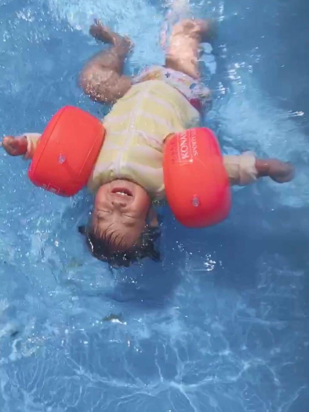黄色と白のボーダーの ラッシュガードは すごい人混みでも みつけやすかったです😂 仰向けでバタ足が お気に召したようです💛 溺れてる訳じゃないよ🤣