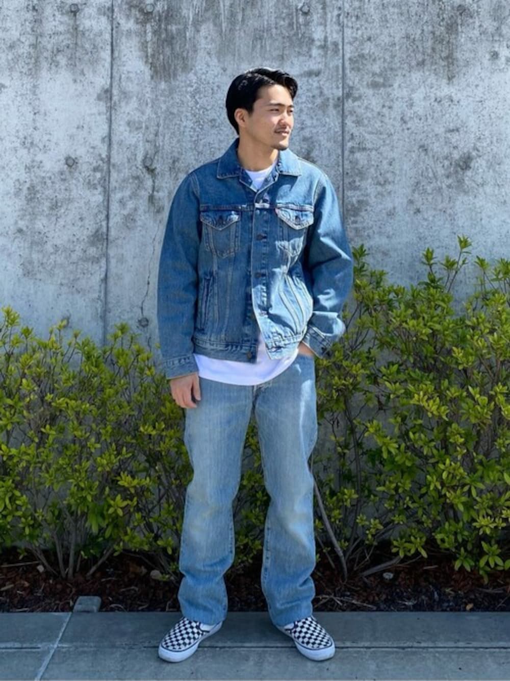 [スタイリングポイント/テーマ] 春のセットアップコーデ 身長:166cm 普段のトップスサイズ:M 普段のボトムスサイズ:w30 年齢:20代前半 [アウター] 着用サイズ:M サイズ感:ゆったり 素材感・着心地:綿100%でしっかりした素材感 肩と袖にゆとりがあるためゆとりもありますし着ていて疲れない。 コメント:普段の着用サイズはMサイズですが このトラッカーの形は2サイズくらい大きい イメージで肩も落ちているデザインで小洒落た感じを出せておすすめのトラッカーです。 [ボトムス] 着用サイズ:W32 サイズ感:ゆったり 素材感・着心地:501らしい綿100%ですが ここまでウォッシュもかかっているので そこまでごわごわした感じはなくはきやすいです。 コメント:made in usaだからこそのエイジング が特徴で、春だけではなく夏にも Tシャツ1枚にこのデニムを是非合わせて いただきたい。