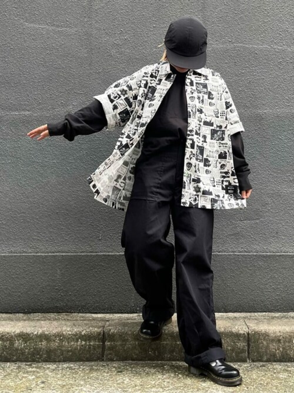【スタイリングポイント/テーマ】 涼しい季節にぴったり! 新発売のMONSTERSコラボ商品を使った モノトーンストリートコーデ!! カジュアルなストリートコーデもモノトーンでまとめるとシックで高見えします◎ 身長:152cm 骨格タイプ:ストレート パーソナルカラー:ブルベ冬 普段のサイズ:S, W23 20代前半 *************************************************************** 【TOPS】 着用サイズ: S サイズ感:ゆったりめ 素材感・着心地:ややパリッとした生地感 コメント:新発売のMONSTERSコラボシャツ! たくさんのMONSTERSがデザインされたインパクト大の総柄シャツです! メンズアイテムですが、袖をツーロールくらいすれば女性らしくも着られます! ショートパンツ&ブーツの組み合わせもかわいい♡ 【インナー】 着用サイズ: S サイズ感:ゆったりめ 素材感・着心地:肌触りがよく着心地抜群 コメント:レディースのロンティには出せないシルエットでボーイッシュに合わせたい時にぴったり!インナーでも使えるから1枚持ってるととても便利◎ 【ボトムス】 着用サイズ: W23 サイズ感:ゆったりめ 素材感・着心地:柔らかいのにややハリがある質感 裾が少し絞られており緩やかなテーパードシルエット コメント:流行のバギーパンツからノンデニムのブラックが新登場! 大きなポケットが特徴的でトレンドのアウトドアスタイルにも◎ 【アクセサリー】 素材感:ナイロン コメント:シンプルなデザインのナイロンキャップは 幅広い世代の方につかっていただけるアイテムです!