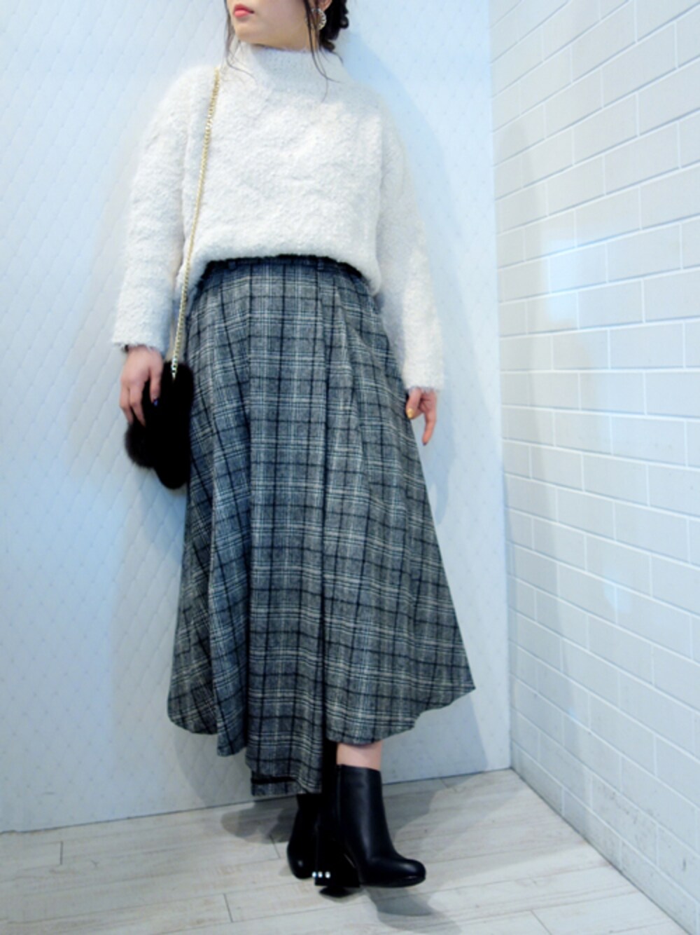 チェックのクラシカルなスカートにシャギーニットで カジュアルリラックス