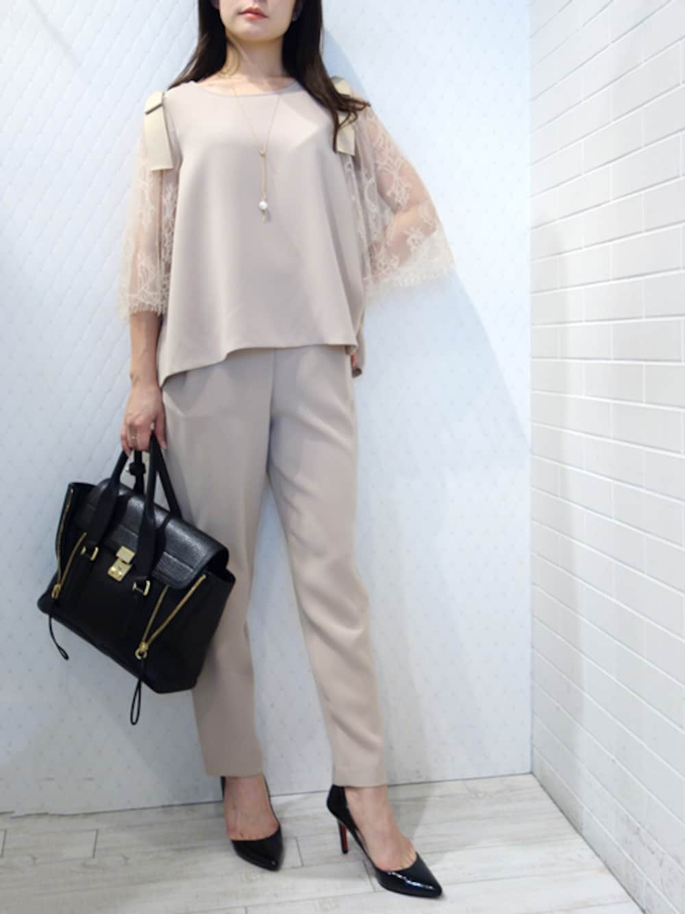 袖がレースになった女性らしいセットアップ