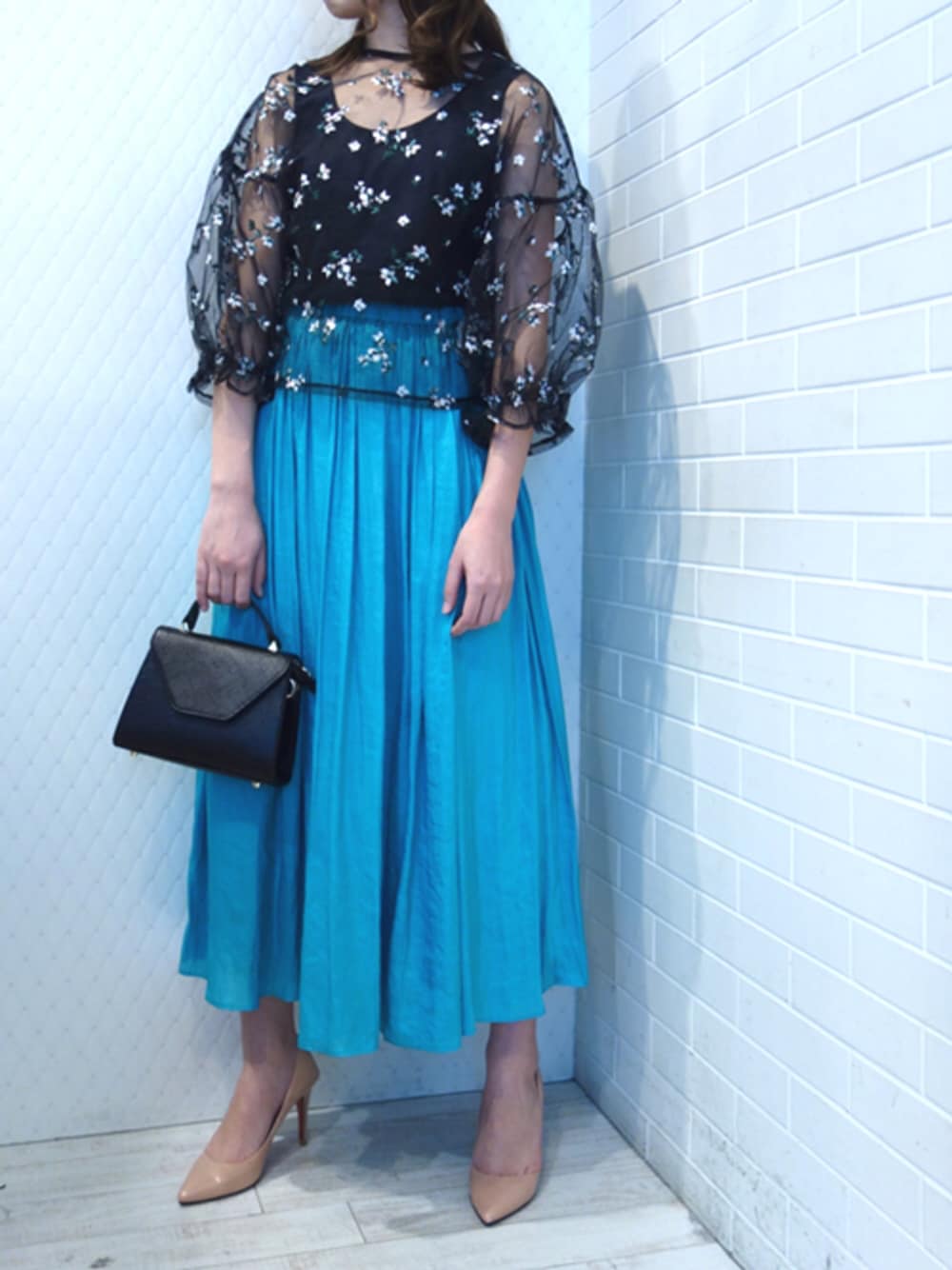 透け感のあるチュールにフラワー刺繍が施された甘く贅沢なトップスで女子コーデ