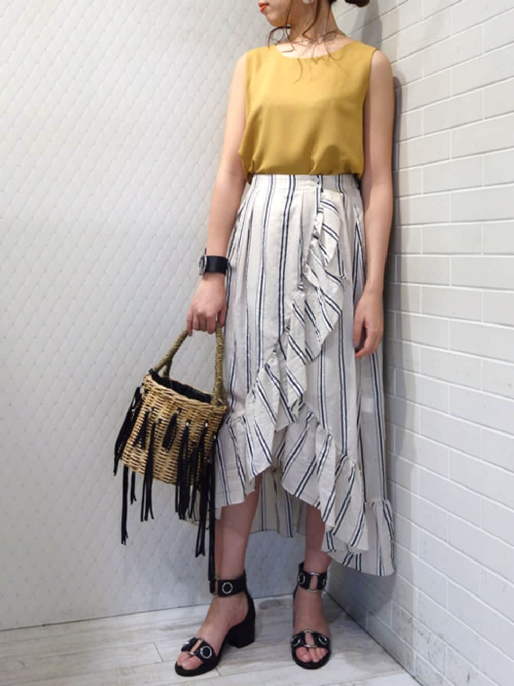 マスタードイエロー×アイボリーのコントラストがきれいな大人女子コーデ ストライプのカジュアルになりがちなスカートもラッフルがエレガントに