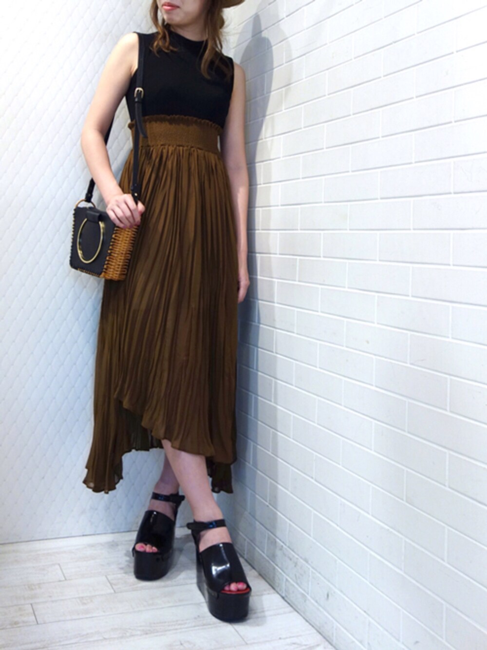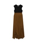 コンパクトなノースリーブトップスとランダムヘムラインのプリーツスカートのコンビワンピース 一着で大人エレガントなスタイルの完成です