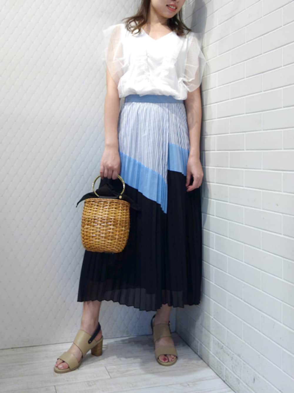 ランダムなカラーとプリーツが印象的なスカートコーデ トップスのチュールも女性らしい雰囲気に