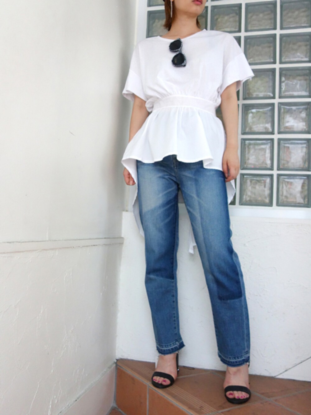 燕尾服のようなバックシルエットがユーモアのあるトップスでカジュアルコーデ