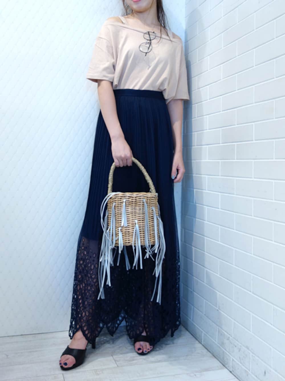 細やかなプリーツと透け感のあるレースが贅沢なマキシスカートコーデ