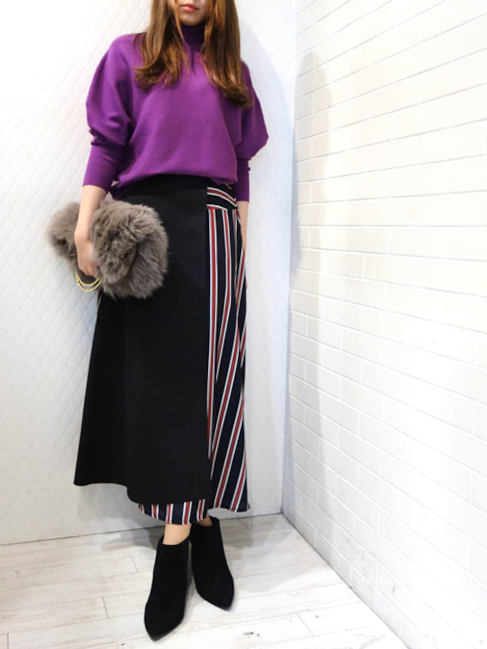 レジメンタルスカートが注目度UPのコーデ トレンドのパープルがきれいです
