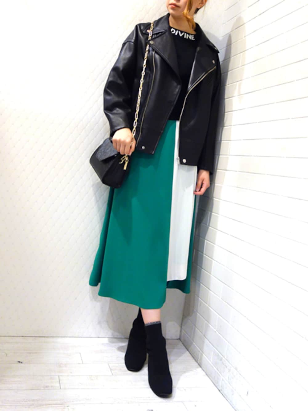 GreenのフレアからWhiteのプリーツがきれいなコントラストのスカートコーデ レディライクなスカートにはハードなライダースで甘辛MIX