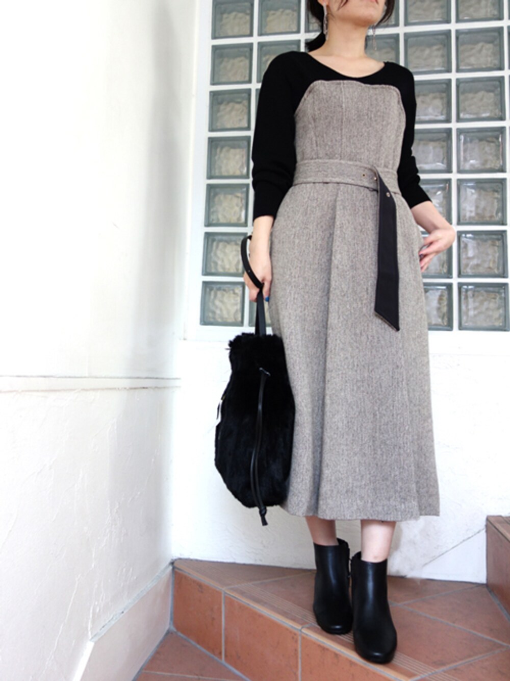 ニットとヘリンボーンのコンビワンピースで大人きれいめコーデ