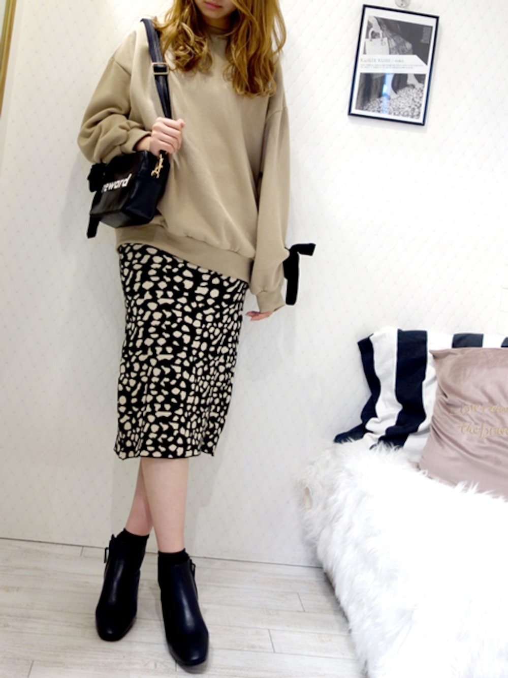 ダルメシアン柄のスカートで大人モード スウェットのリボンでちょっとアクセント