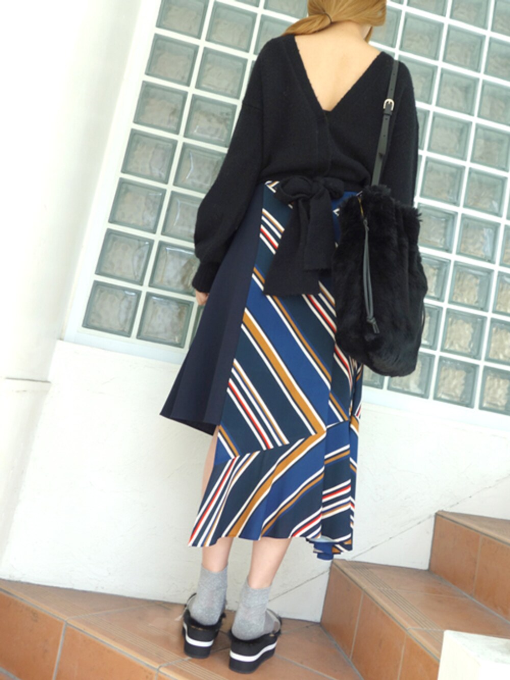 前後どちらでも着れちゃう2WAYカーディガン 後ろにリボンをもってきました アシンメトリーのストライプスカートでちょいレトロ