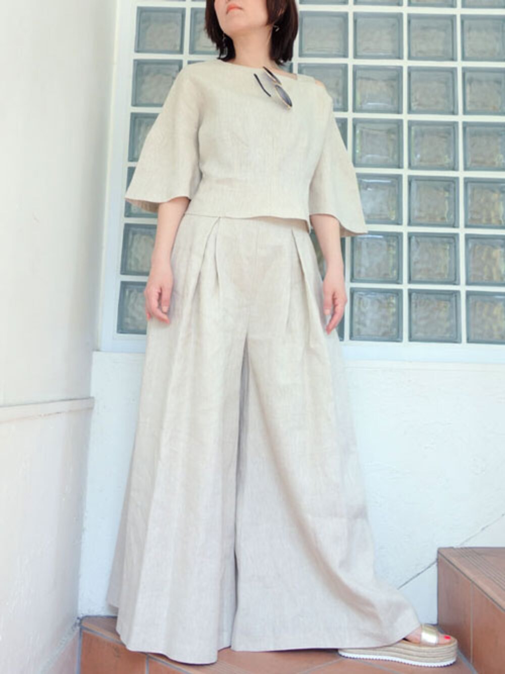 涼しげなリネン素材のアシンメトリーセットアップ。