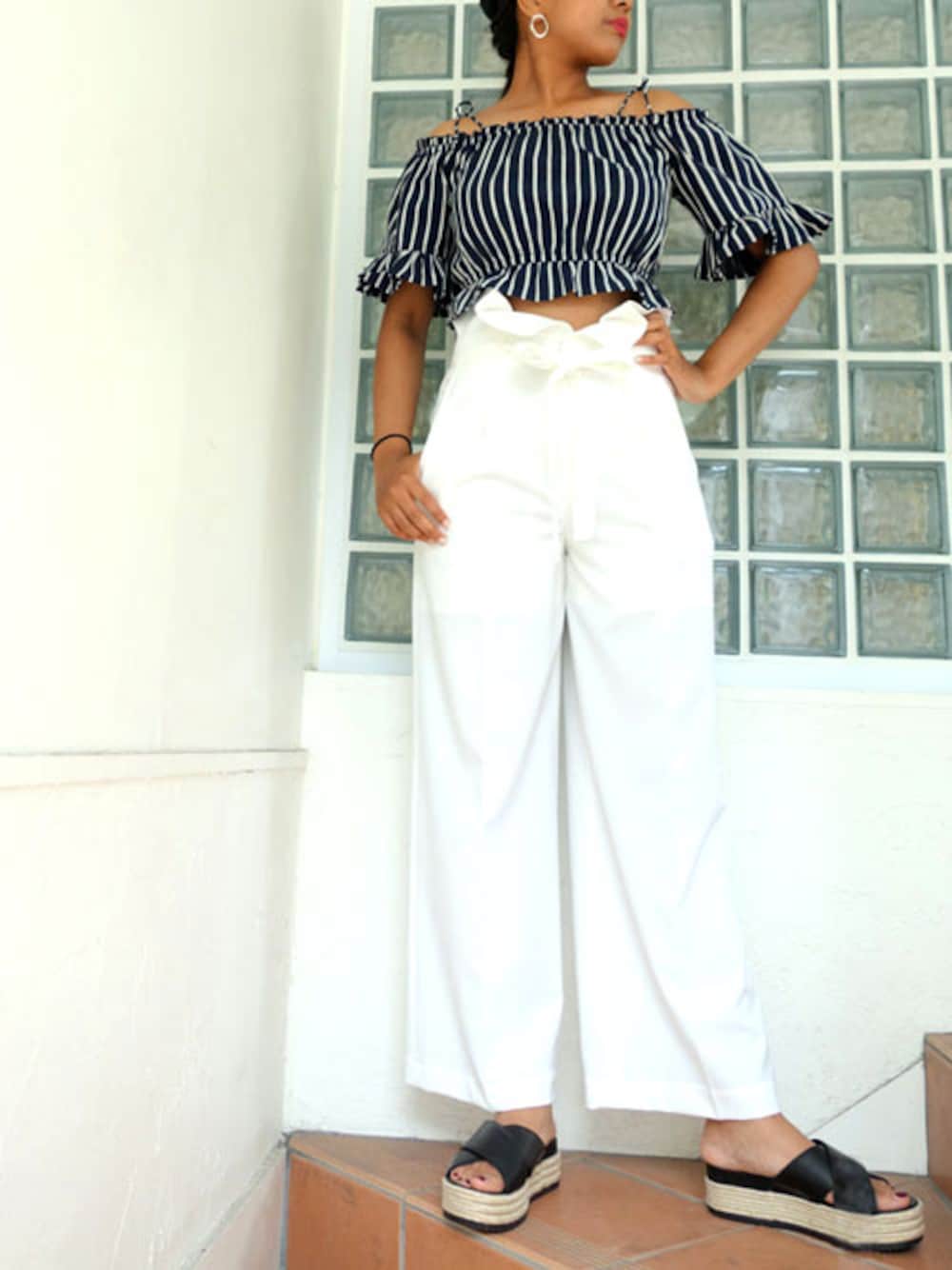 甘めのオフショルトップスもハイウエストのホワイトパンツで大人なマリンスタイルに変身!!