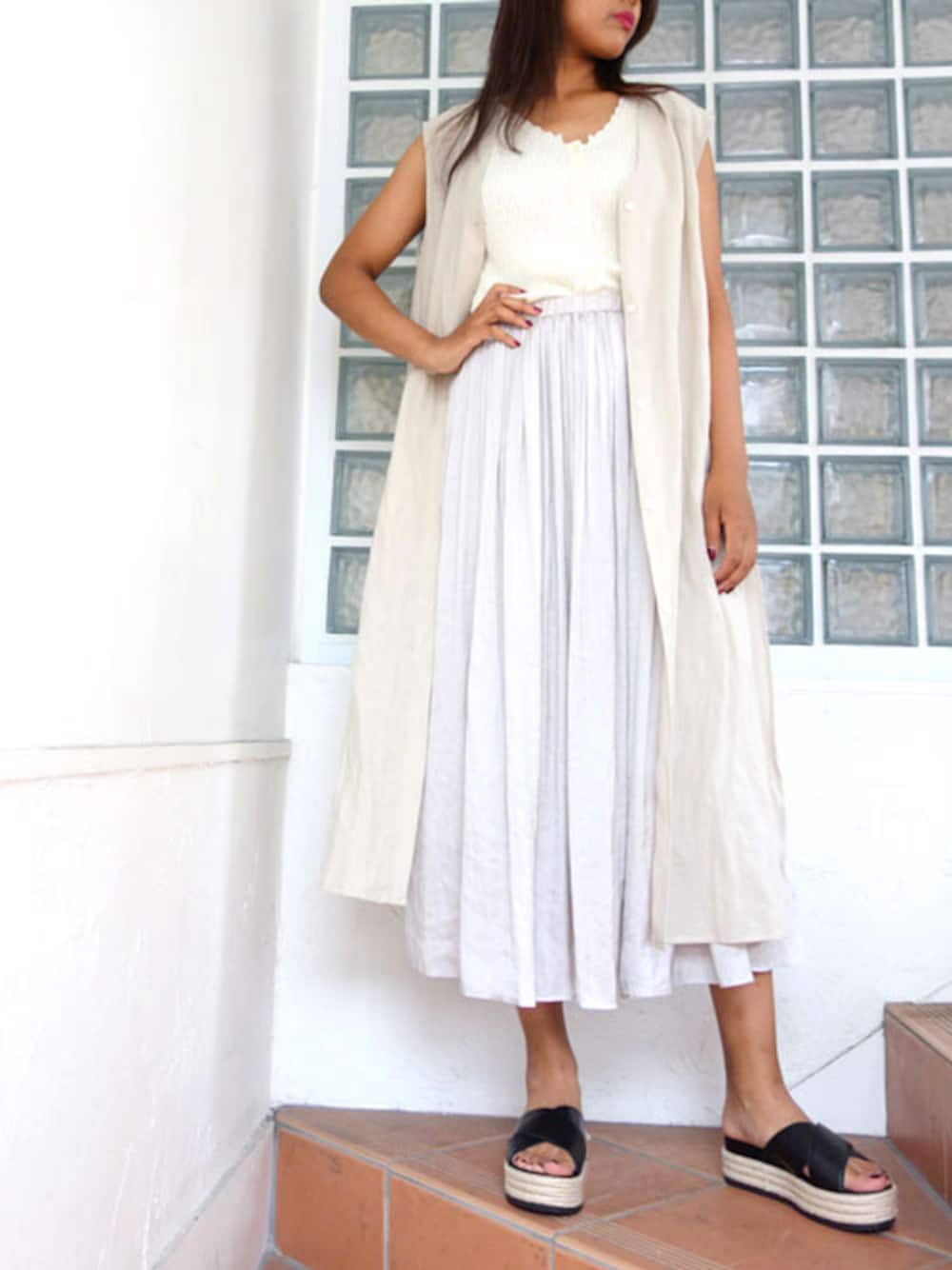 ナチュラルな風合いのロングジレで縦長ラインを意識したスタイルUPコーデ
