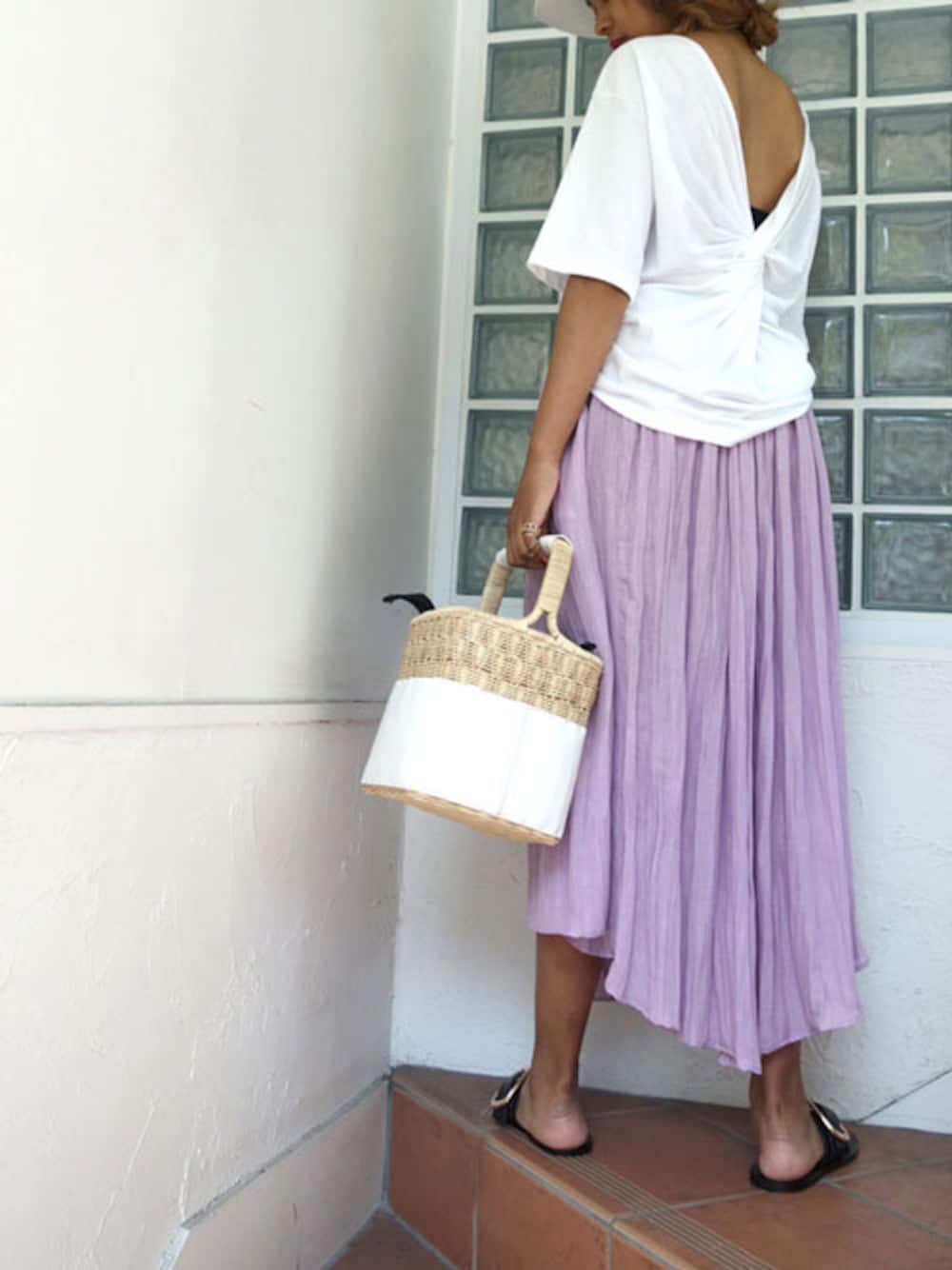 前後どちらでも着れるねじれTシャツ ランダムヘムラインのスカートが女性らしい夏のコーディネイト