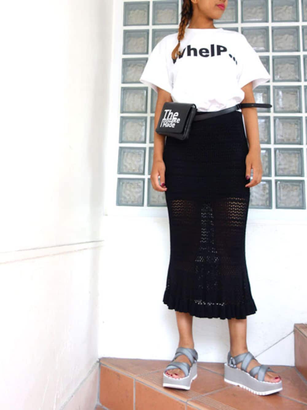 フェミニンなかぎあみスカートとオーバーサイズのロゴTでミックススタイル