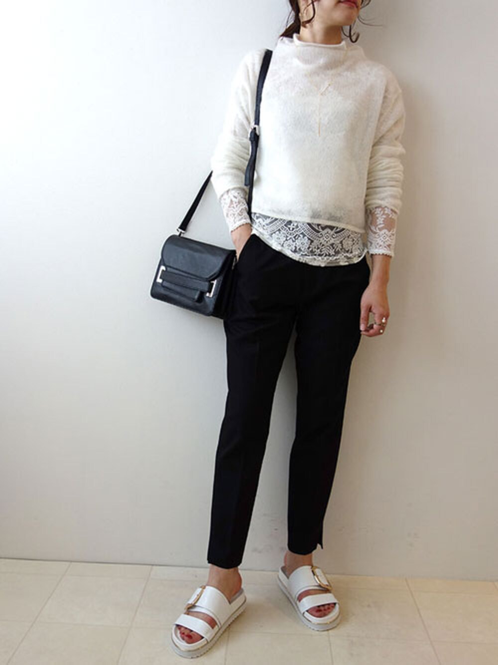 レイヤードコーデ。レースとニットで透け感をだして大人な印象のコーデにコンフォートサンダルで抜け感を♡