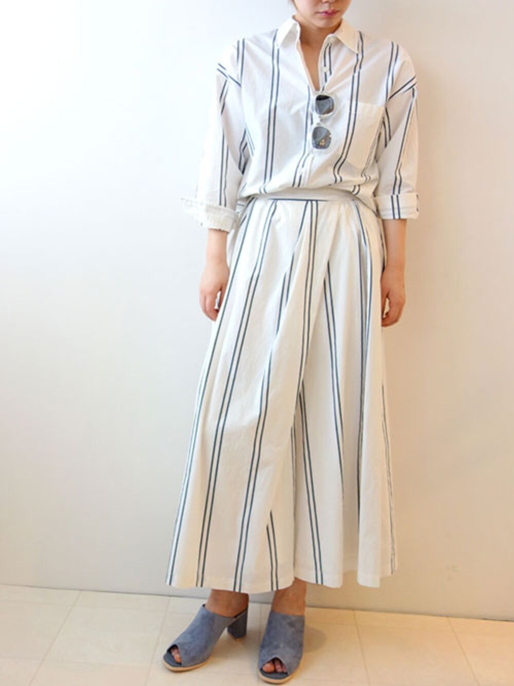 ルーズ×ルーズ ネイビーのストライプとベージュイエロ-の異なるストライプが入った爽やかなセットアップ