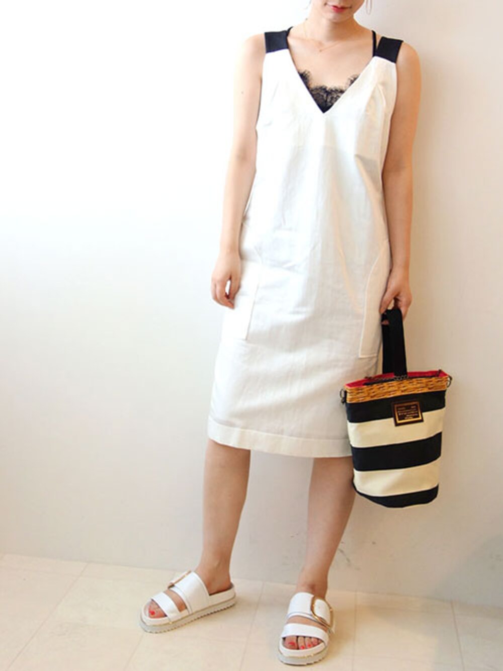 さわやかホワイトコーデ 深めのVからのぞくレースが色っぽいコーディネイトです。