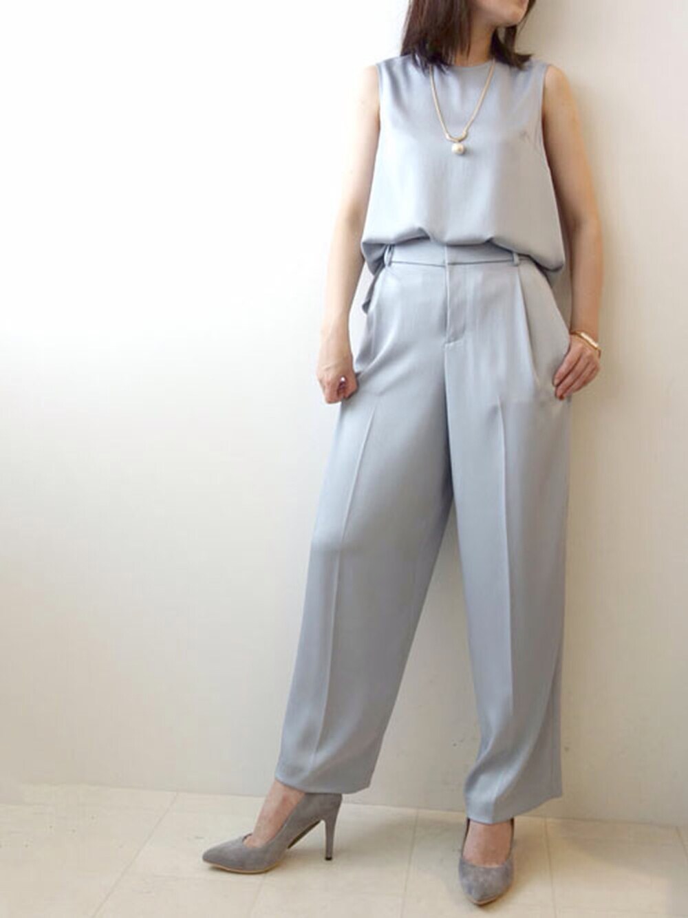 光沢のあるセットアップは上品で大人なコーディネイトに オフィスやPTA アクセサリーを大ぶりなものにすればオケージョンとしても使えます