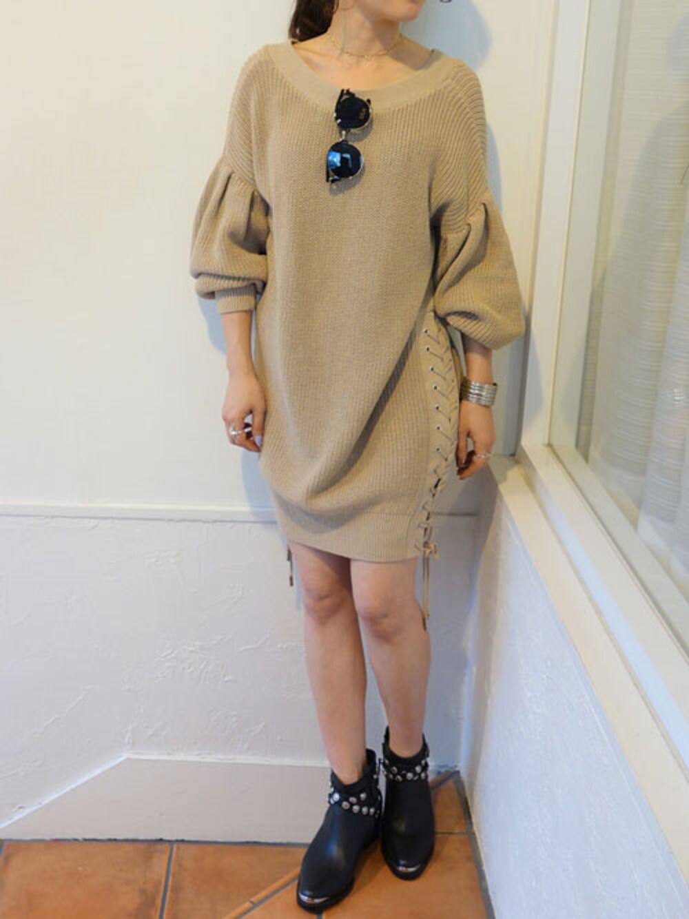 サイドのレースアップとふんわりスリーブが可愛いワンピース