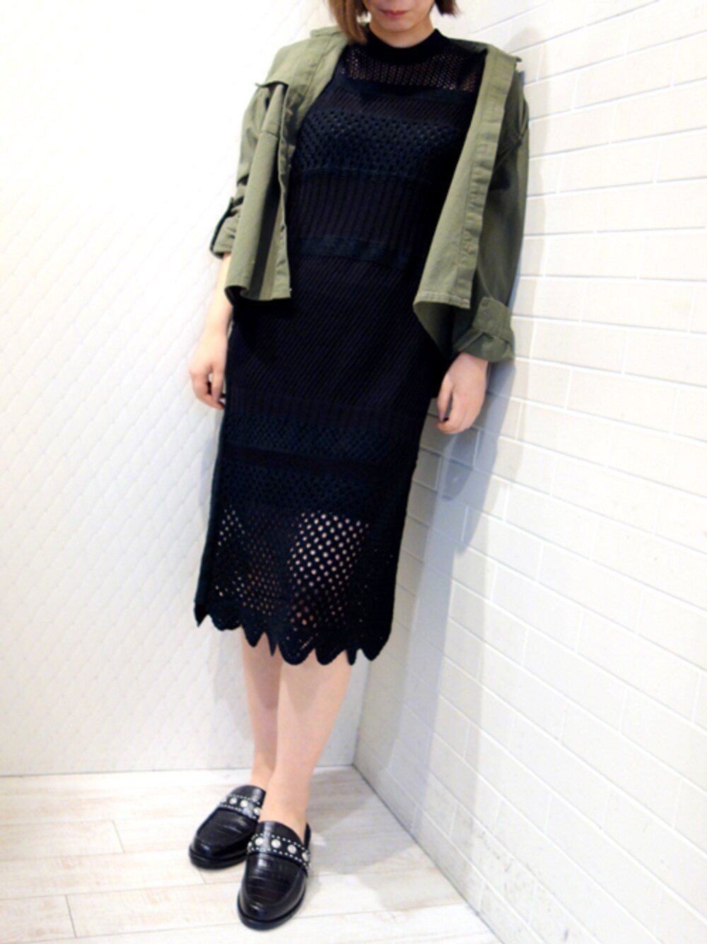 メッシュの透け感とフィット感がバッチリのワンピースをミリタリージャケットでカジュアルダウン