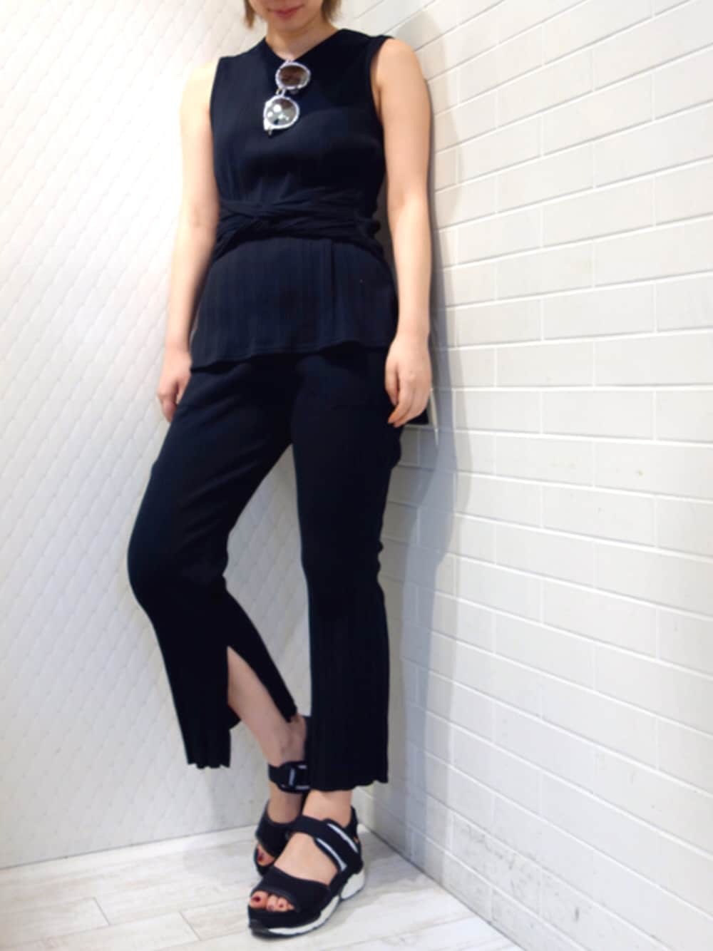 オールブラック ウエストがベルトみたいなデザイン×くるぶしチラみせスリットでちょいシンプル
